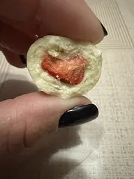 Белый шоколад (сахар, какао-масло, сухое цельное молоко , лактоза , сухое обезжиренное молоко , эмульгатор: соевый лецитин, ароматизатор: ваниль), сушеная клубника, глазирующий агент: шеллак; глицерин, сироп декстрозы, камедь акации, сахар, пшеничный крахмал, растительное масло, ароматизатор: йогурт.