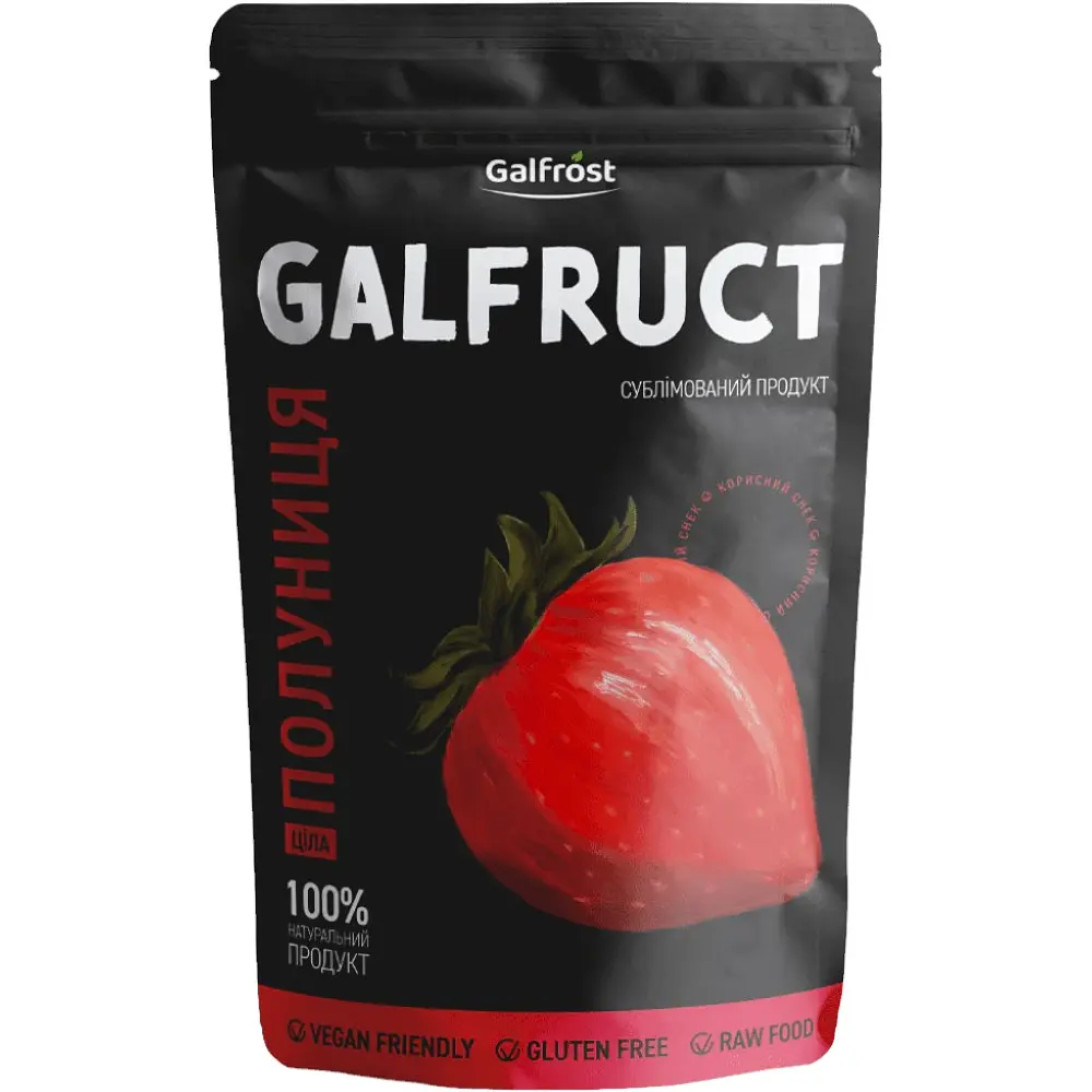 Клубника сублимированная Galfruct - это натуральный продукт, который изготавливается из свежих спелых ягод без добавления сахара, консервантов или других искусственных добавок. Благодаря минимальной обработке, ломтики клубники сохраняют свои природные вкусовые качества, аромат и текстуру.