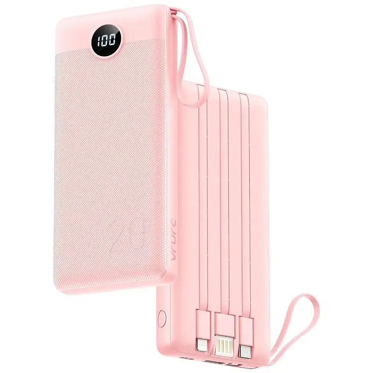 Портативное зарядное устройство со встроенными кабелями: быстрое портативное зарядное устройство емкостью 20000 мАч, встроенный кабель USB-C (9 В / 2 а), микрокабель (5 В / 2,4 а) и другой кабель, совместимый с iPhone. Поддерживает быструю зарядку для мобильных телефонов напрямую, также встроен входной кабель 5V/2 a USB-A для зарядки. Это портативное зарядное устройство поддерживает зарядку ваших устройств в любом месте, когда у вас нет дополнительных кабелей.