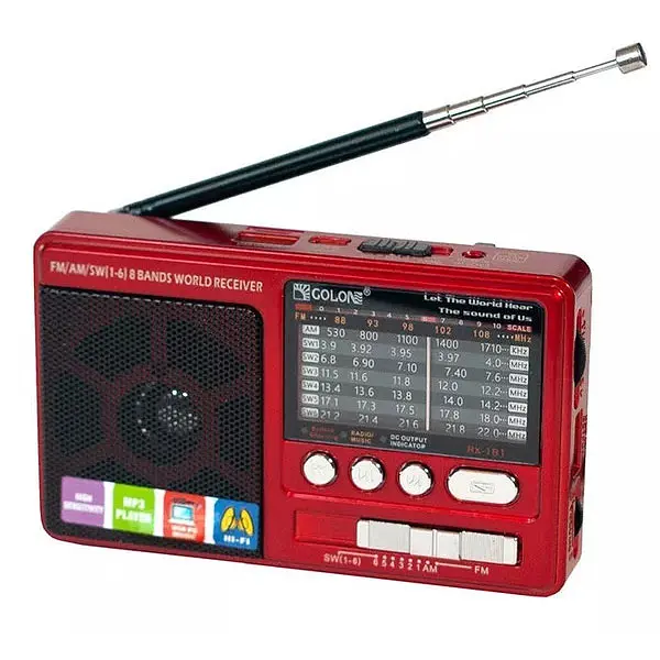 Портативный многодиапазонный радиоприемник Golon RX-181 позволяет прослушивать радиостанции в диапазонах FM/AM/SW(1-6) благодаря телескопической антенне, что обеспечивает уверенный прием даже при слабом сигнале. Устройство воспроизводит аудиофайлы MP3/WMA (музыку и аудиокниги) с MicroSD-карт или USB-накопителей через удобную клавиатуру на передней панели для управления и переключатель частотного диапазона. Работает от съемного Li-Ion аккумулятора емкостью 600 мАч (входит в комплект), заряжаемого через комплектный USB-miniUSB-кабель, или от батареек типа R6. Поддерживает функцию Power Bank для подзарядки мобильных устройств. Оснащенный светодиодным индикатором зарядки, фонариком и имеет компактные размеры 125х75х30 мм и вес 230 г. Идеален для походов, дачи или дома.