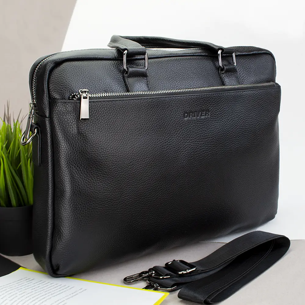 Удобный кожаный портфель DRIVER by DE ESSE легко поместит в себе небольшой ноутбук или планшет, документы формата А4. Натуральная кожа высочайшего качества приятна на ощупь и долговечна. В комплекте имеется длинный текстильный ремень (125 см) и 2 удобные ручки. Одно большое отделение на молнии. Внутри большой карман на молнии, 2 кармана для мобильного телефона или павербанка и отделение для ноутбука на липучке (13 дюймов, размер до 32*20 см), если ноутбук больше - его можно разместить в общем отделении (размером до 36*24). Снаружи с обеих сторон 2 больших кармана на молнии. Этот портфель вмещает все необходимые вещи современного делового мужчины, присмотритесь к этому варианту.