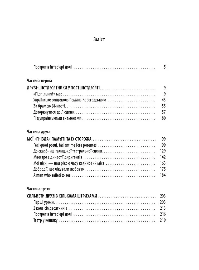 Книга «Портрет в интерьере судьбы» — дань памяти украинским шестидесятникам-диссидентам, которые выступили против советско-кгб-ской системы за право Украины быть. Автор с теплотой и любовью рассказывает о своих друзьях из круга шестидесятников, людях знаменитых, но не всегда известных. В первой части «Друзья-шестидесятники в постшестидесятые» речь идет о литературоведе Михаиле Коцюбинской, литературоведе и писателе Романе Корогодском, руководительнице «Союза украинок» Атене Пашко, участнике и основателе Общества украинского языка имени Тараса Шевченко Романе Крип’якевича.