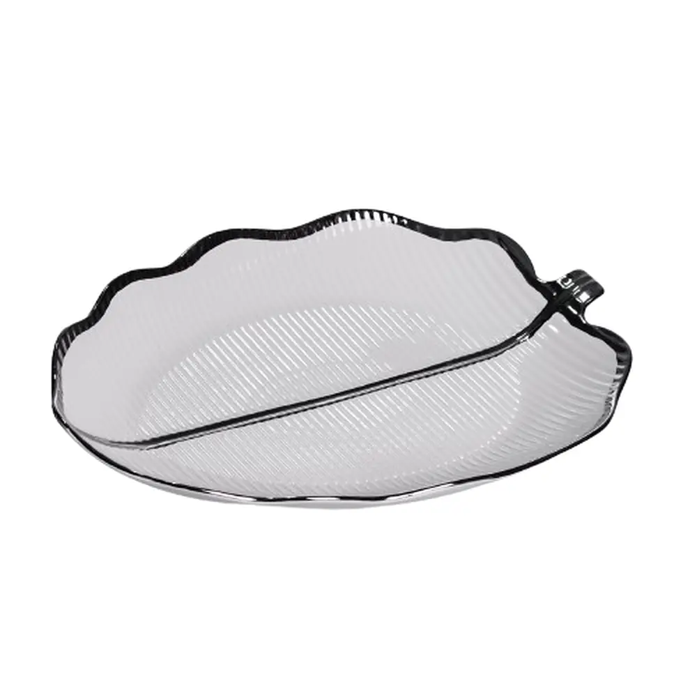 Выполненная из белого фарфора, она имеет изящную, плавную форму, напоминающую большой лист. Главная особенность дизайна – контрастный черный ободок, который подчеркивает контур изделия и придает ему выразительность.