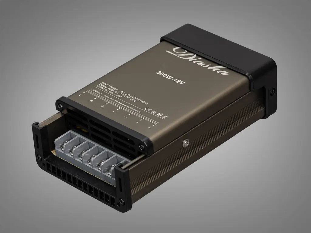 Мощные блоки питания PPF-PW-IP54-12V-300W для светодиодных лент Diasha. Блок питания PPF-PW-IP54-12V-300W от ТМ "Diasha" впечатляет своим массивным видом и бескомпромиссной мощностью. Алюминиевый корпус с прочной обработкой и элегантными черными вставками выглядит внушительно и сразу вызывает доверие. Его строгие геометрические линии подчеркивают профессиональный уровень устройства, а вентилятор активного охлаждения гарантирует стабильную работу даже в самых сложных условиях.