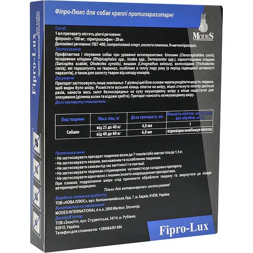 Modes Fipro-Lux для собак и кошек относится к комбинированным инсекто-акарицидным препаратам. Обладает инсекто-акарицидной активностью в отношении преимагинальных и имагинальных фаз развития блох, вшей, волосоедов, иксодовых и саркоптоидных клещей, паразитирующих на собаках и котах.