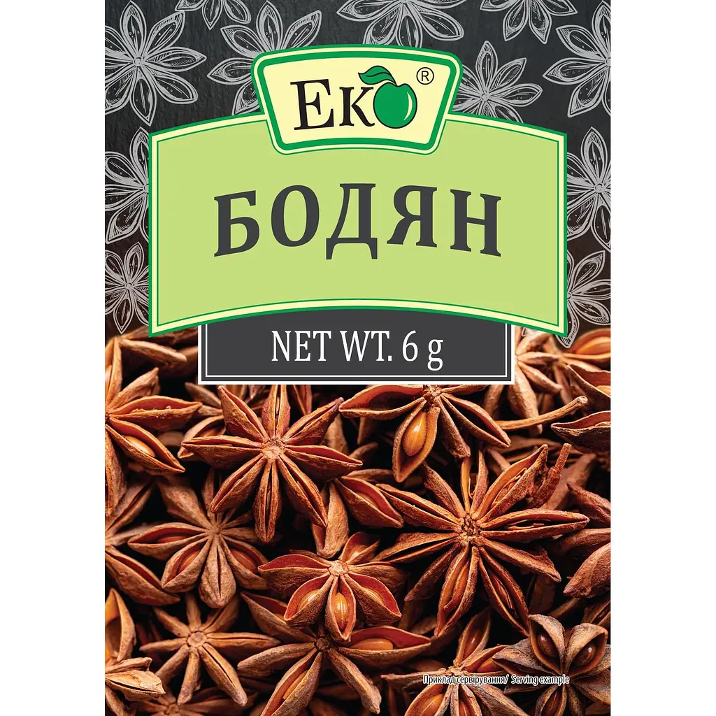 Бадьян від бренду Еко — ароматна спеція з характерним солодкувато-пряним смаком та легкими нотами анісу. Використовується для приготування десертів, випічки, глінтвейну, компотів та маринадів. Чудово поєднується з кавою та чаєм, додаючи напою вишуканого аромату. У компактній упаковці 6 г, яка зберігає свіжість та насиченість спеції.