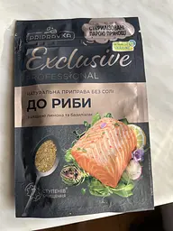 Після покупки приправи "Exclusive Professional" до риби, від виробника "Приправка", впевнився, що такі знайшов ідеальну приправу до риби та рибних страв. Приправа "Exclusive Professional" мае натуральний состав, який чудово підходе до риби. До деяких сортів риби, інколи додаю ще трішкі лимонного перцю, але це не обов‘язково, а за смаком, тому що приправа мае чудово збалансований склад та в додаваннях не мае нужди. Люби рибні страви з ціею приправою - соковиті, смачні та ароматні, мають неперевершений смак. Приправа розроблена дуже продумано, не мае нічого зайвого, всі інгрідіенти натуральні. Вага пакету з приправою в 45 грамів - дуже вигідна для покупки. При такої ціні, якість - просто казкова. Обов‘язково замовлю ще, бо на мій погляд, ця приправа незамінна для приготування страв з риби.