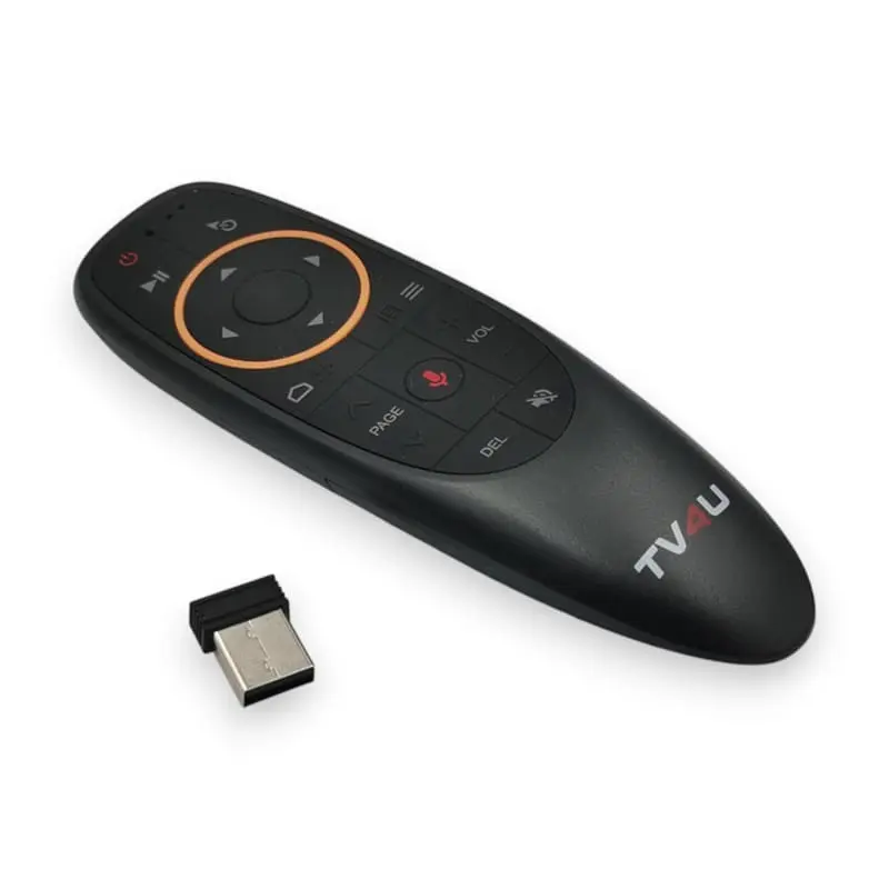 Гироскопический пульт TV4U G10s с поддержкой голосового управления (имеющий встроенный микрофон) и программируемой кнопкой выключения. Данная модель поддерживает Google Voice Search и Google Voice Assistant. Пульт TV4U G10s имеет эргономичную форму, удобно лежит в руке.