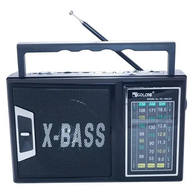 Радиоприемник Golon RX-166 LED – удобное устройство со встроенным аккумулятором, экономящее на батарейках, обеспечивая отличный прием радиостанций благодаря выдвижной телескопической антенне. Поддерживает воспроизведение MP3 с карт памяти SD и USB-флешек, а также позволяет подключать наушники или активные колонки. Имеет приятный дизайн и яркий светодиодный фонарь сбоку с двумя режимами (1LED+8LED). Управление производится кнопкой на передней панели для переключения треков, механическим переключателем между радио и внешними носителями, а также механической регуляцией громкости. Поддерживает подключение мультимедиа через комплектный кабель. Работает в диапазонах FM (64–108 MHz) и AM (530–1600 kHz), с питанием от аккумулятора, сети 220 В или двух батареек 1.5 В (R20).