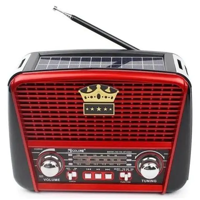 До конца акции 7 днейПортативная колонка Golon RX-455S Solar – 3-х волновой радиоприемник с солнечными батареями, фонариком и аналоговым тюнером, работающий на волнах FM (88-108 МГц), AM (530-1710 кГц) и SW (9-16 МГц). Воспроизводит музыку с USB-флешек и карт памяти TF, а также работает как Power Bank с выходом DC 5.5/2.1 мм 4V. Стилизованное под ретро-радиолы 50-х, устройство оснащено ремнем через плечо. Работает от встроенного аккумулятора, заряжаемого от сети 220 В, адаптера 6V 1A (не входит в комплект) или солнечных панелей (полная зарядка – около 10 часов на свете). Также поддерживает питание от двух батареек 1.5V типа UM-1 К20/D. Один динамик обеспечивает воспроизведение звука.