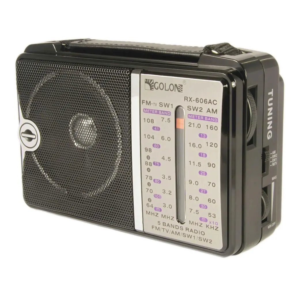 Радиоприемник Golon RX-606AC – 5-ти волновое устройство с диапазонами AM (530-1600 кГц), FM (64-108 МГц), TV (2-5), SW1 (5.8-7.5 МГц) и SW2 (8.8-12.3 МГц). Оснащен телескопической антенной для надежного приема сигнала. Работает от сети 220 В, двух батареек R20 (1.5 В, не входят в комплект) или альтернативного питания. Имеет вес 490 г, размеры 105х160х60 мм.