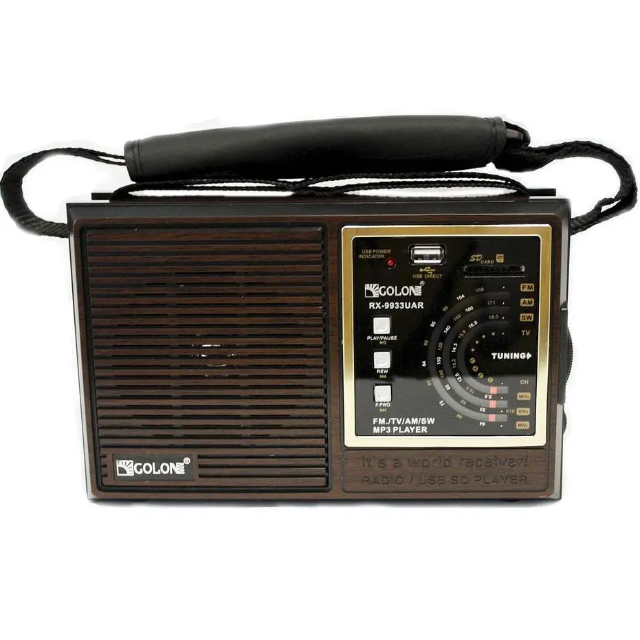 Радиоприемник Golon RX-9933 UAR – мультидиапазонное устройство с высокой чувствительностью, идеальное для зон с неуверенным приемом. Поддерживает воспроизведение MP3/WMA/WAV аудиофайлов с USB-флешек и SD-карт, а стильный ретро-дизайн, напоминающий приемники марки Селга (Selga), делает его удобным для пожилых людей – идеальный подарок для бабушки и дедушки. Оснащен длинной телескопической антенной (800 мм) для уверенного приема, имеет аналоговый тюнер для УКВ (64-108 МГц), КВ (7.5-19.0 МГц) и СВ (530-1600 кГц), включая расширенный FM-диапазон с «советским» стандартом. диапазоне. Работает от встроенного аккумулятора, сети 220 В или четырех батарей R20 (не входят в комплект), укомплектованный удобным ремнем. Дополнительно оснащен SD-кардридером, USB-слотом, аудиовыходом для наушников или аудиосистем и индикатором зарядки.