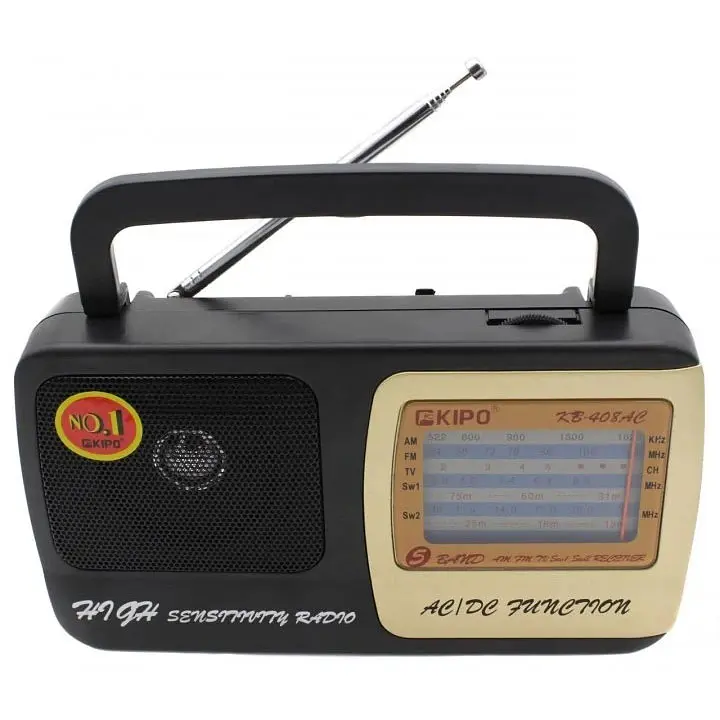 Радиоприемник Kipo KB-408AC – портативное устройство с аналоговым тюнером AM/SW/FM, а KIPO KB-308AC дополнительно поддерживает TV-частоты, позволяющие принимать аудиоканалы эфирного телевидения. Обе модели работают в диапазонах: AM (530-1600 кГц), FM (64-108 МГц), SW1 (5.8-7.5 МГц) и SW2 (8.8-12.3 МГц); KB-308AC также включает TV (2-5 каналов). Оснащены телескопической антенной для надежного приёма, имеют выход для наушников 3.5 мм и питаются от сети 220 В или двух батареек R20 (1.5 В, не входят в комплект). Размеры: 117 х 205 х 68 мм, вес – 446 г (без батареек).