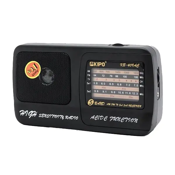 Радиоприемник Kipo KB-409AC – портативное устройство с аналоговым тюнером AM/SW/FM, а KIPO KB-308A дополнительно поддерживает TV-частоты для приема аудиоканалов эфирного телевидения. Обе модели работают в диапазонах: AM (530–1600 кГц), FM (64–108 МГц), SW1 (5,8–7,5 МГц) и SW2 (8,8–12,3 МГц); KB-308A также включает TV (2-5 каналов). Оснащены телескопической антенной для надежного приема и имеют выход для наушников 3.5 мм. Работают от сети 220 В или двух батареек R20 (1.5 В, не входят в комплект). Размеры: 117 х 205 х 68 мм, вес – 446 г (без батареек).