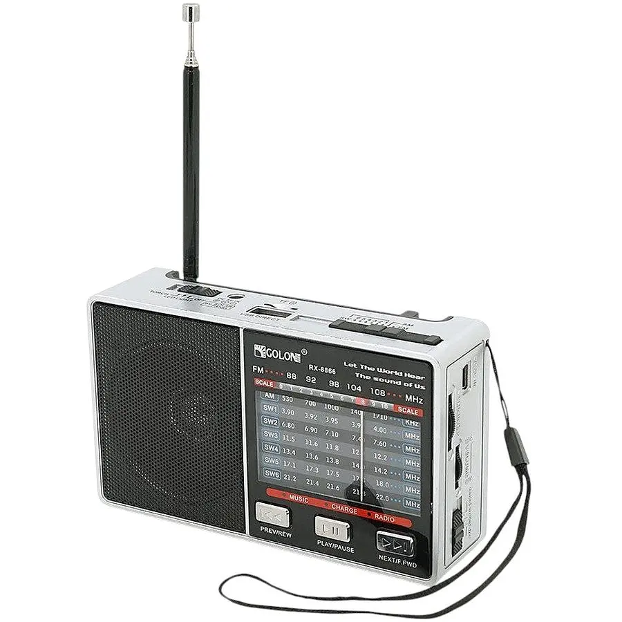 Радиоприемник Golon RX8866S – портативный динамик/радио/колонка, позволяющий слушать любимую музыку с любого носителя: с USB флешки, карты памяти SD или станции FM радио. Данная модель приемника имеет отличное качество приемки, даже в отдаленных местах. Широкий шаг между радиостанциями, легко настроиться на ту или иную частоту. Портативная FM колонка не велика, ее легко носить с собой, также есть мощный LED фонарик 1W. Работает от аккумулятора 1 шт. или от универсального USB адаптера 220 В, а также от батареек типа ААА (3 шт. – в комплект не входят).