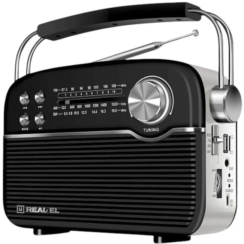 Радиоприемник портативный REAL-EL X545 Black. REAL-EL X545 может хорошо принимать сигнал радиостанций в любых диапазонах – от FM до AM и SW. Но ведь на дворе XXI века — современные портативные устройства должны уметь гораздо больше. Инженеры REAL-EL знают об этом как никто другой, поэтому добавили в устройство и возможность воспроизводить аудио со смартфона или другого гаджета с помощью Bluetooth и воспроизведения музыкальных файлов с USB-накопителя или карты памяти microSD. По сути, это полноценная портативная акустика, которая просто больше ориентирована именно на прослушивание радио.