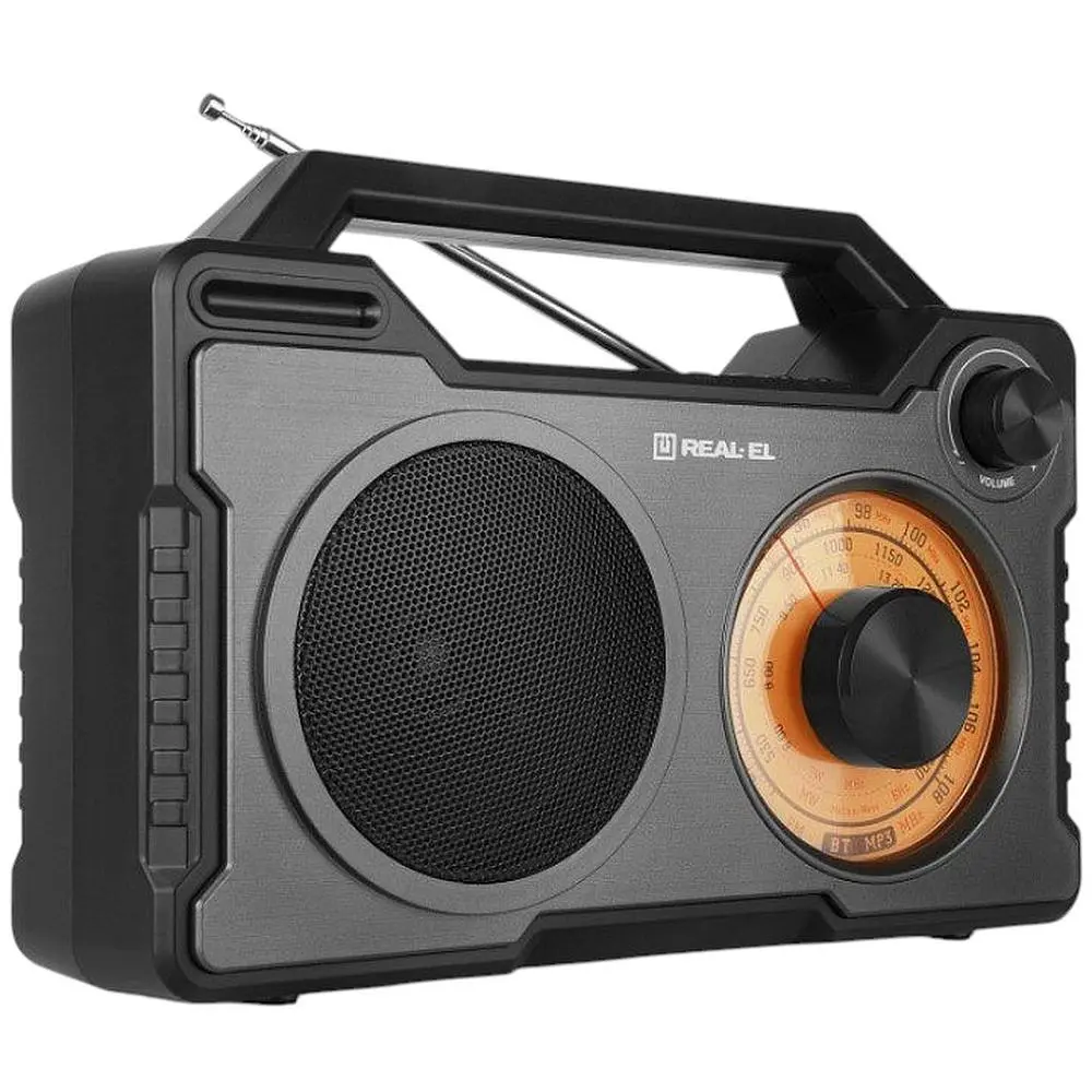 - REAL-EL X703 — не просто радиоприемник, а настоящий мобильный аудиоцентр. Кроме приема радиопрограмм, он может служить в качестве Bluetooth-колонки и подключаться к внешним источникам сигнала с помощью проволоки. Наличие внешнего проигрывателя одновременно необязательно, устройство поддерживает воспроизведение MP3-файлов с накопителей USB-flash и карт microSD.