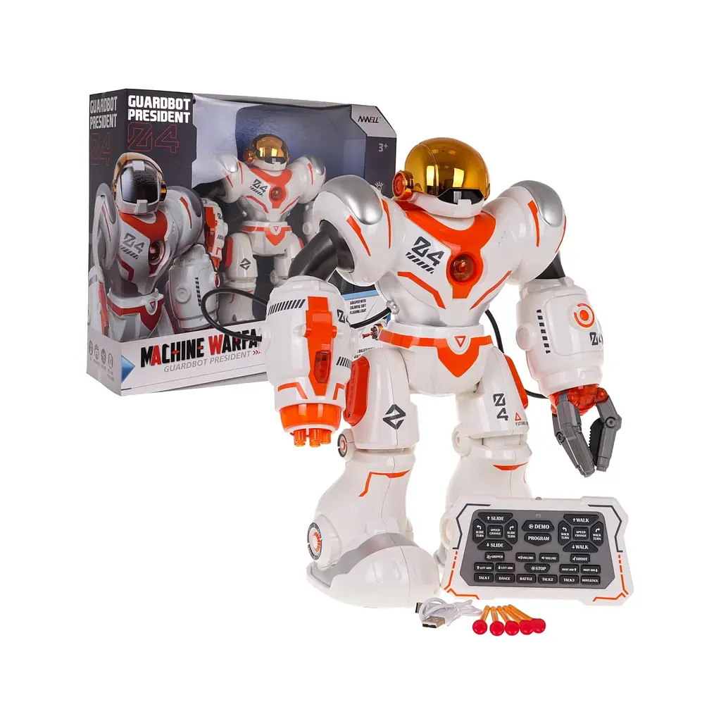 Интерактивный робот на дистанционном управлении с подсветкой, звуками и возможностью стрелять мягкими дротиками! Разработан для детей от 3 лет. Управляется с помощью пульта, двигает руками и ногами, танцует, «разговаривает» и даже может выполнять программируемые действия в заданной последовательности.