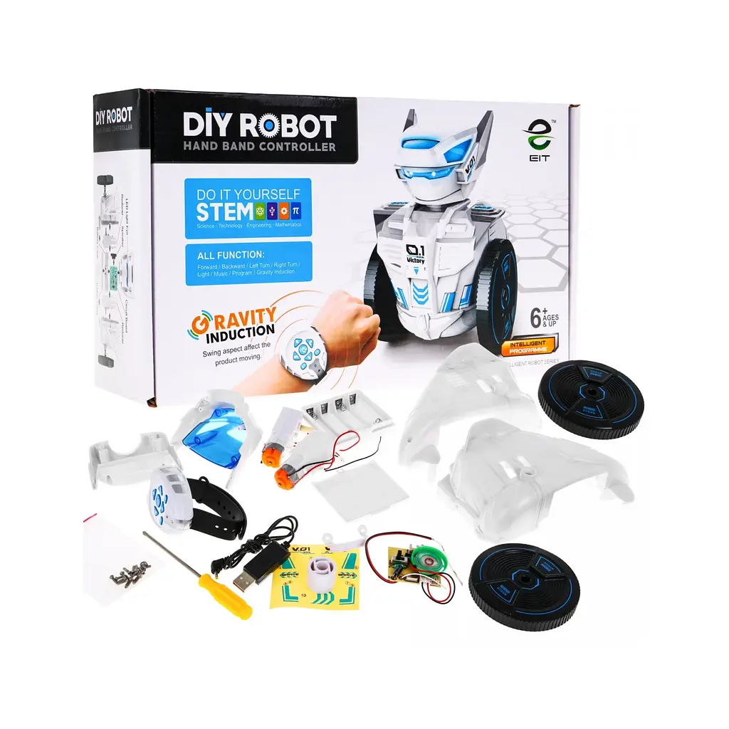 Этот умный робот — не просто игрушка, а настоящий вызов для юного инженера! Предназначенный для детей от 6 лет, он собирается самостоятельно без необходимости в дополнительных инструментах. После сборки робот оживает: его глаза светятся LED-подсветкой, а во время игры он издает интересные звуковые и световые эффекты. Управление осуществляется с помощью инновационных часов — стоит лишь наклонить руку или нажать кнопку, и робот движется в соответствующем направлении. Весело, интересно и развивающе!