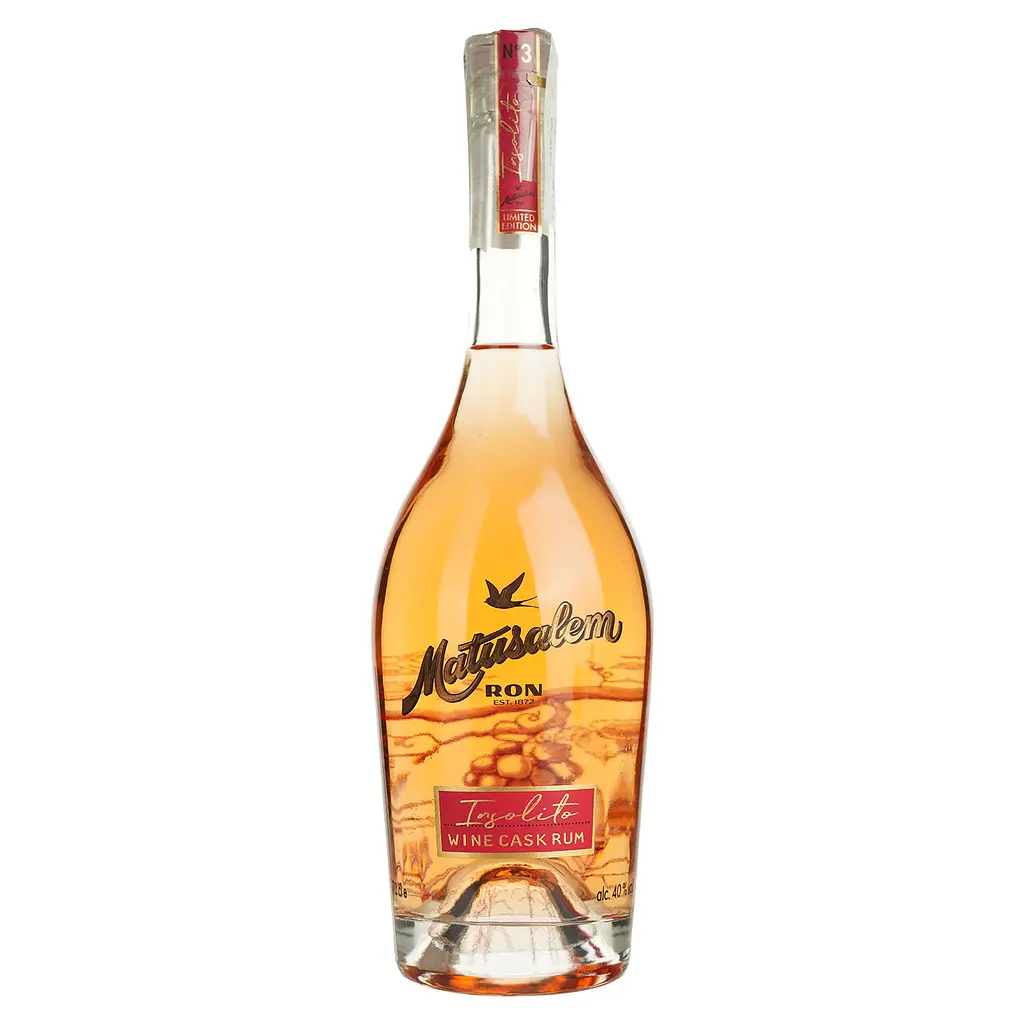 Ром Matusalem (Матусалем) Insolito Wine Cask Finish характеризуется сбалансированным, мягким, сладким вкусом, с фруктовими нотами, оттенками цедры апельсина и поджаренного хлеба. Имеет продолжительное послевкусие.