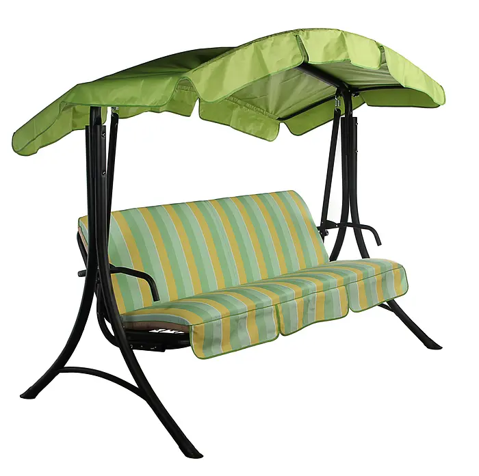 Классические садовые качели с округлой крышей и с длиной сиденья 170 см. Предназначены для отдыха до 4-х взрослых лиц. Каркас садовых качелей изготовлен из стальной трубы диаметром 50 мм и покрыт полимерной краской, которая способствует повышению износостойкости качелей, а именно, не растрескивается и защищает металл от ржавчины. Сидение и спинка качелей – упругая металлическая сетка на пружинах. Она не провисает и в то же время достаточно комфортна для отдыхающего. Сидение можно зафиксировать от раскачивания с помощью крючков расположенных на ножках качелей. Данная модель легко трансформируется из дивана в постель. Для этого достаточно приподнять ручку с любой стороны вверх и откинуть спинку. Угол наклона тента (наклон вверх-вниз) регулируется боковыми фиксаторами на крыше. Качели комплектуются: матрасом и тканевым тентом. Обивка матраса изготовлена из ткани тексилка, крыша - из ткани оксфорда. Ткань тексилк специально разработана для уличной мебели и имеет следующие преимущества: