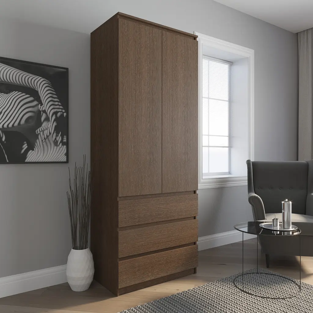 Шкаф для одежды Vays R-9 - функциональное решение для спальни, гостиной или прихожей. Оснащен 3 вместительными ящиками и штангой для вешалок, идеально подходит для хранения одежды и аксессуаров. Минималистичный дизайн без ручек придает современность, а прочная конструкция из ЛДСП гарантирует долговечность. Компактные размеры позволяют разместить шкаф даже в небольшом помещении.