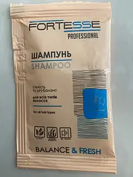 Шампунь Fortesse Professional Balance & Fresh чудово підходить для всіх типів волосся! Легкий, освіжаючий, добре очищує, не пересушує шкіру голови. Волосся після миття залишається свіжим і природним, без тяжкості. Компактний об’єм 15 мл зручно брати в дорогу або на пробу. Рекомендую тим, хто хоче баланс між ефективністю та делікатністю.