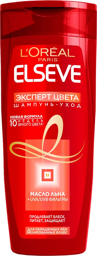 Шампунь L’Oréal Paris (Лореаль Париж) Elseve Эксперт Цвета - это серия по уходу за окрашенными или мелированными волосами. Формула соединяет в себе питательный концентрат и защиту от UVA/UVB лучей для двойного действия.