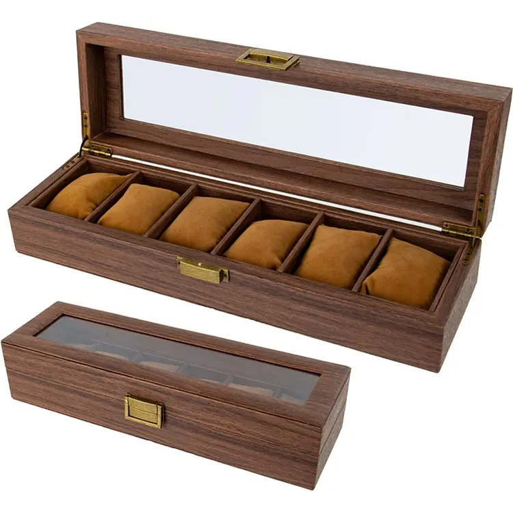 Шкатулка для часов имеет насыщенный темный оттенок. Ее размеры обеспечивают достаточное место для хранения. В ящике есть три отдельных отделения, каждое из которых выстлано мягкой, бежевой тканью для защиты часов от царапин. Прозрачная стеклянная крышка позволяет выставлять часы на показ одновременно защищая их от пыли.
