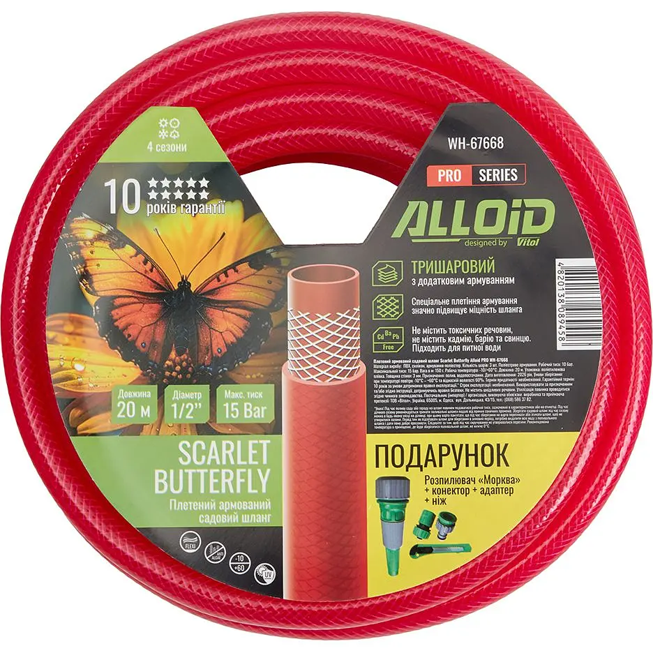 Шланг армированный 3-х слойный Alloid Building Tools Scarlet Butterfly - це якісний і довговічний інструмент для поливу та господарських робіт, який поєднує в собі міцність, зручність у використанні та високий рівень ефективності. Завдяки тришаровій армованій конструкції шланг стійкий до зламів, скручувань і впливу високого тиску, що робить його ідеальним вибором для догляду за садом, городом, газоном або присадибною ділянкою. Додатковою перевагою є подарунок у комплекті, який робить покупку ще вигіднішою.