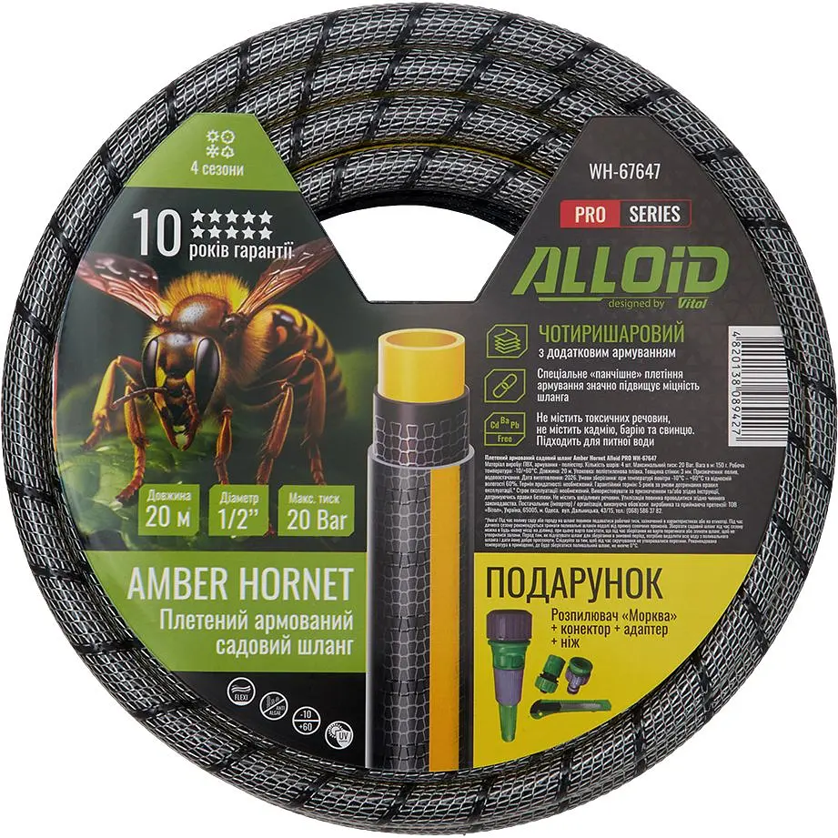 Шланг армированный 4-х слойный Alloid Building Tools Amber Hornett - усиленный шланг профессионального уровня для интенсивного полива и хозяйственных работ. Четырехслойная армированная конструкция обеспечивает максимальную прочность, устойчивость к высокому давлению и длительный срок службы.