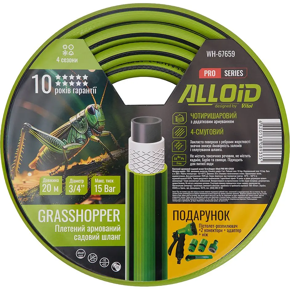 4-слойный армированный шланг Alloid Building Tools Grasshopper - это прочный и надежный инструмент для полива и хозяйственных работ, сочетающий в себе высокую износостойкость, удобство в использовании и эффективную подачу воды. Благодаря четырехслойной армированной конструкции шланг устойчив к изломам, скручиванию и воздействию высокого давления, что делает его отличным выбором для сада, огорода, газона или приусадебного участка. Дополнительным преимуществом является подарок в комплекте, который повышает выгодность покупки.