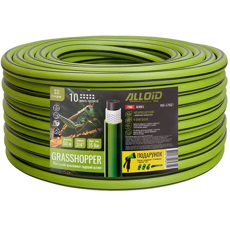 Шланг армированный 4-х слойный Alloid Building Tools Grasshopper - это прочный и надежный инструмент для полива и хозяйственных работ, сочетающий в себе высокую износостойкость, удобство в использовании и эффективную подачу воды. Благодаря четырехслойной армированной конструкции шланг устойчив к изломам, скручиванию и воздействию высокого давления, что делает его отличным выбором для сада, огорода, газона или приусадебного участка. Дополнительным преимуществом является подарок в комплекте, который повышает выгодность покупки.