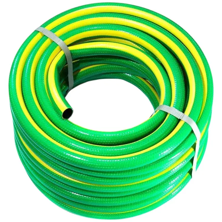 Прозрачный наружный слой выполняет роль защиты шланга от механических повреждений и истирания. Сетчатая оплетка из прочной синтетической нити, составляющая промежуточный слой, делает шланг устойчивым к растяжению и разрывам при рабочем давлении до 5 атмосфер. Третий желтый слой дополнительно увеличивает общую толщину шланга и его способность сохранять форму во время эксплуатации и хранения. Внутренний слой с гладкой стенкой не создает препятствий потоку жидкости внутри шланга и не содержит в своем составе примесей свинца, бария и кадмия.