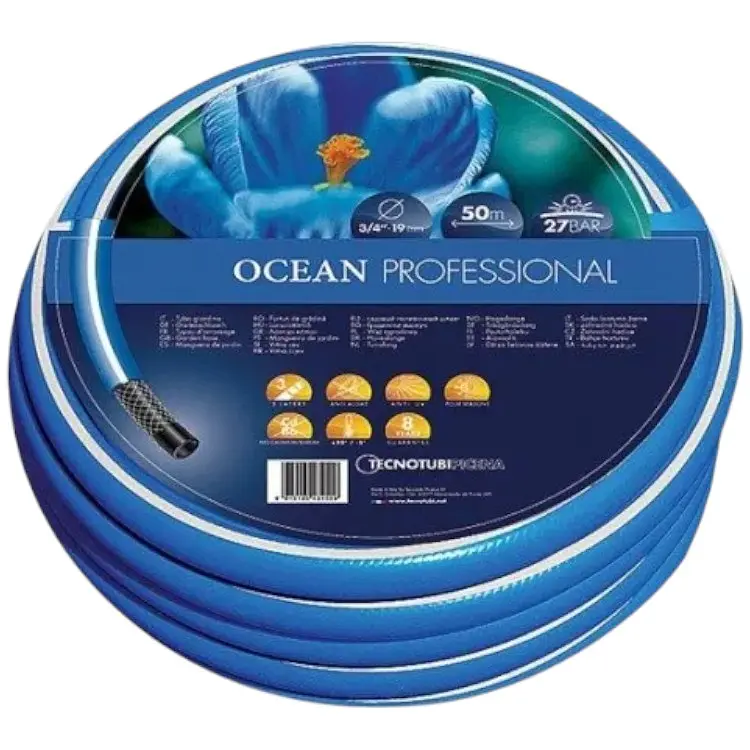 Армированные трехслойные шланги с увеличенной толщиной стенки серии Ocean изготовлены на заводе Tecnotubi в Италии. Они отличаются высокой прочностью и эластичностью, устойчивостью к ультрафиолетовому излучению, предназначены для работы на высоком давлении. Допускают использование в широком диапазоне рабочих температур от +50 до -5 °C без ухудшения своих первоначальных технических показателей. Не содержат в своем составе вредных примесей. Плотное внутреннее армирование, изготовленное из полиэстеровой нити, делает эти шланги не подверженными заламыванию и перегибам во время использования. Прекрасно сохраняют свою гибкость и эластичность при высоком давлении воды. Применяемые для изготовления материалы проходят строгий контроль качества, что в сумме с использованием современного технологического процесса позволяет пользоваться шлангами этой серии до 10 лет без потери и снижения их первоначальных характеристик.