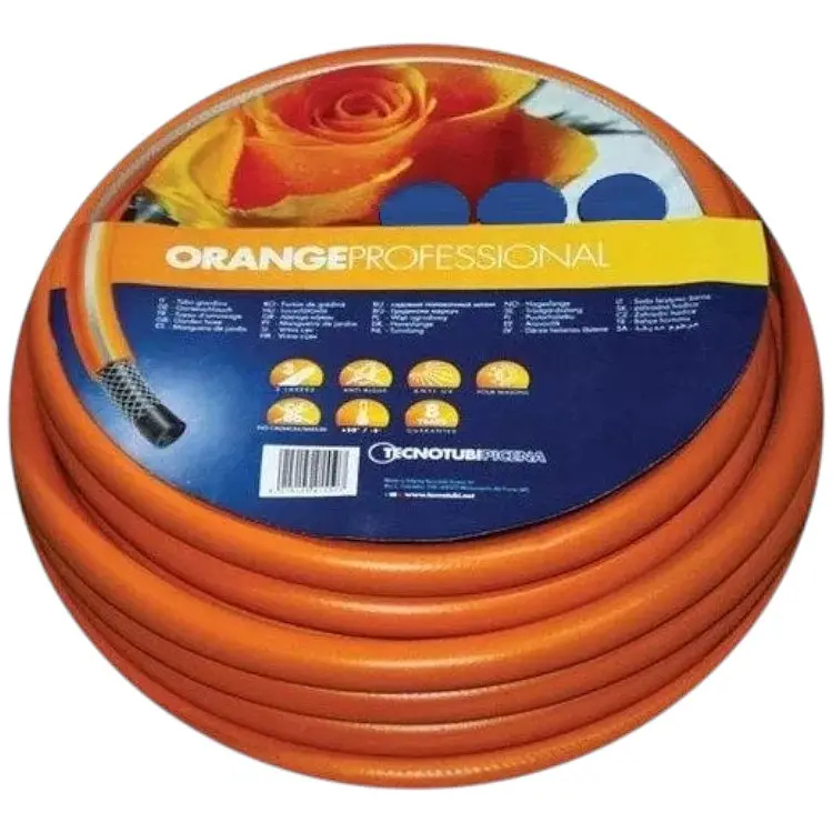 Шланг садовый Tecnotubi Orange Professional для полива длиной 50 метров изготовлен из высококачественного ПВХ, он устойчив к воздействию воды и различных видов садовых удобрений.
