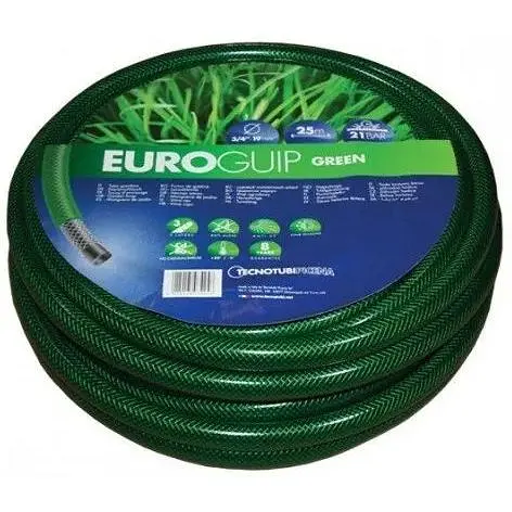 Трехслойные армированные шланги серии Euro Guip Green производства Италии отличаются прочностью, эластичностью, устойчивыми к ультрафиолетовому излучению. Допускается использование в широком диапазоне температур окружающей среды от +50 до -5 °C без изменения своих эксплуатационных характеристик. Не содержат в своем составе вредных примесей. Прочное внутреннее армирование нитью из полиэстера позволяет шлангу не скручиваться и не перегибаться. Сохраняет гибкость и эластичность даже при высоких давлениях. Благодаря применению исключительно качественных материалов, современному технологическому производству и постоянному контролю качества, этот шланг позволяет использовать его до 8 лет без потери первичных свойств.
