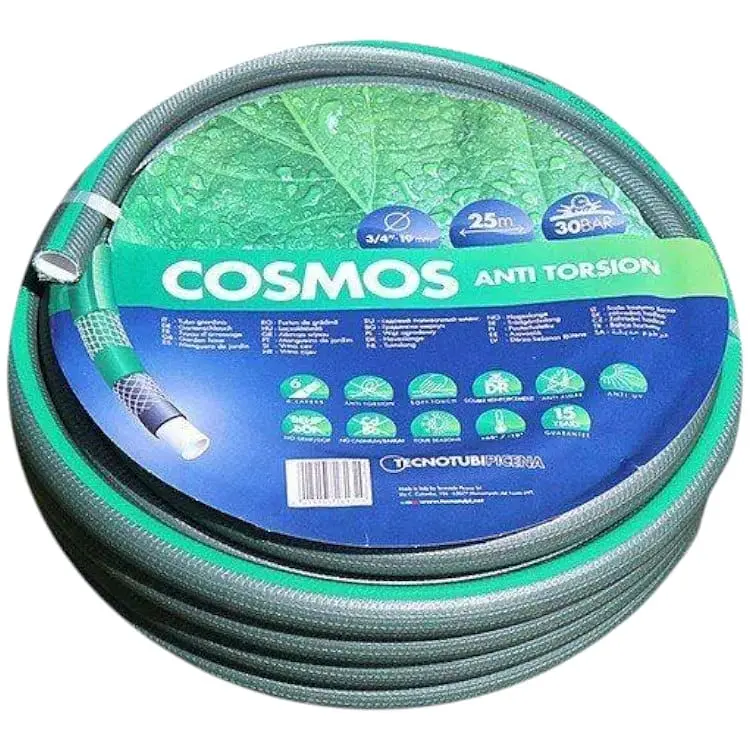 Шестислойные шланги для полива с двойным армированием серии Cosmos производства завода Tecnotubi Италия отличаются повышенной эластичностью, устойчивостью к механическим нагрузкам и могут эксплуатироваться в широком диапазоне температур от +60 до -10 °C. Внутренний слой не содержит вредных примесей бария, кадмия и свинца, что позволяет использовать его для различных пищевых жидкостей и питьевой воды.