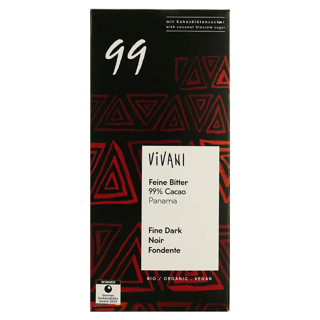 Шоколад черный Vivani Feine Bitter 99% какао создан на основе отборных какао-бобов из Панамы с добавлением ароматного кокосового сахара.
