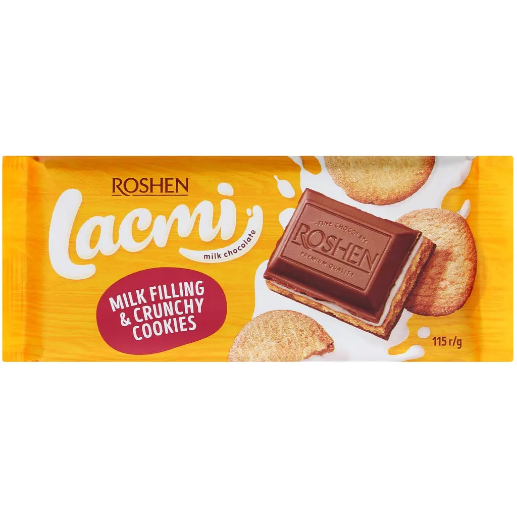 Шоколад молочный Roshen Lacmi с молочной начинкой и печеньем обрадует своим вкусом и не оставит равнодушным никого.