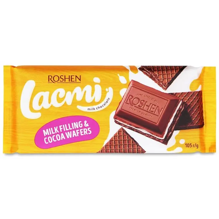 Шоколад молочный Roshen Lacmi представляет собой изысканное сочетание нежного молочного шоколада, легкой молочной начинки и хрустящей вафли.