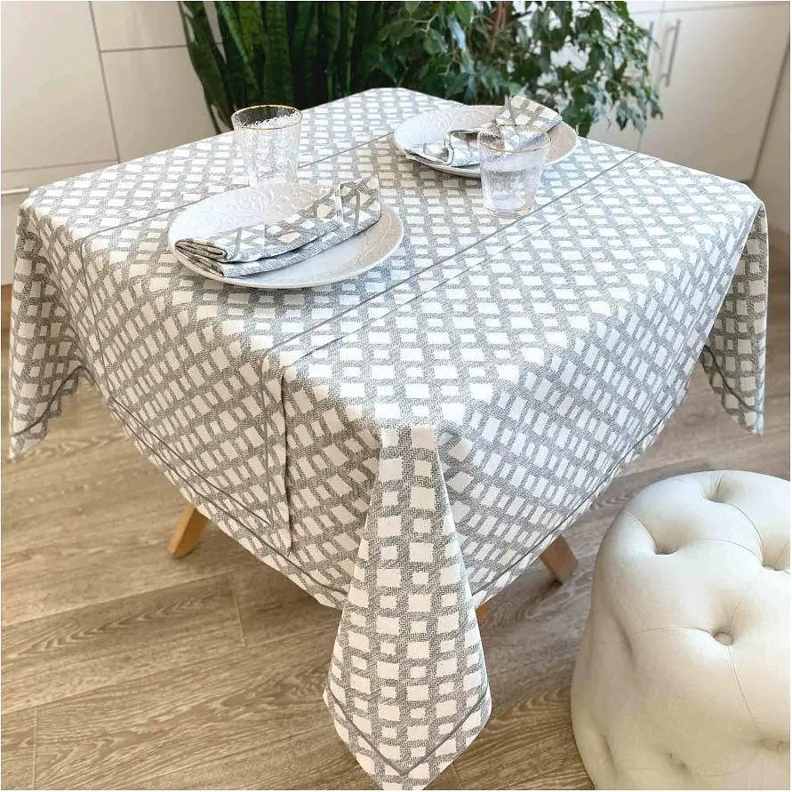 Красивая скатерть украсит гостиную или столовую, по краям вышивка. Расцветка будет отлично гармонировать со светлыми и темными тонами мебели в интерьере.