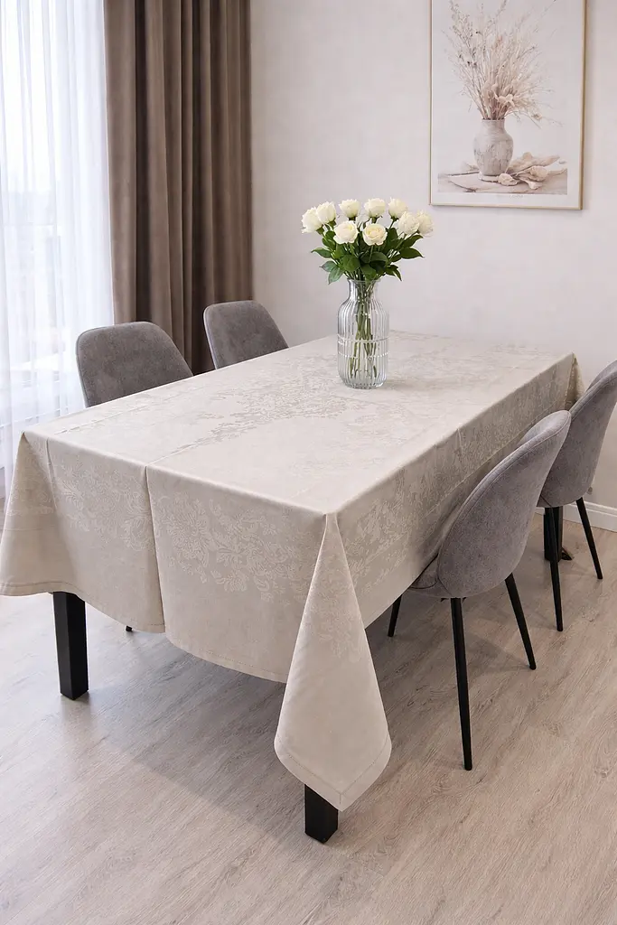 Элитная скатерть размером 160 × 220 см изготовлена из экологически чистой специализированной тефлоновой ткани и украшена изысканным узором в технике ришелье. Современная ткань обладает водоотталкивающей структурой, что обеспечивает скатерти практичность. Скатерть также имеет функцию вышивания, то есть ее можно украсить по желанию собственноручно различными узорами. Данная скатерть презентабельна, дополнит уют и дизайн вашей комнаты.
