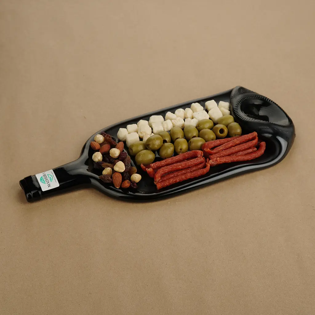 Цікава ідея зробити таку тарілку в формі пляшки, щоб подати закуски для гостей, наші гості були здивовані. Має вишукану насичену чорну трішки з глянцем поверхню, як на мене вмістка, підійде ідеально для подачі ковбасок, сиру, оливок, горішків. Скло трішки просвічує, доволі легка за вагою, в руках не ковзає, виробник Україна.Однозначно рекомендую ця тарілка стане цікавинкою і прикрасою вашого столу. Або як вишуканий подарунок друзям, впевнена будуть задоволені. Чудово писалась до нашого чорного скляного набору тарілок від luminarc. На Maudau як завжди приємні знижки.