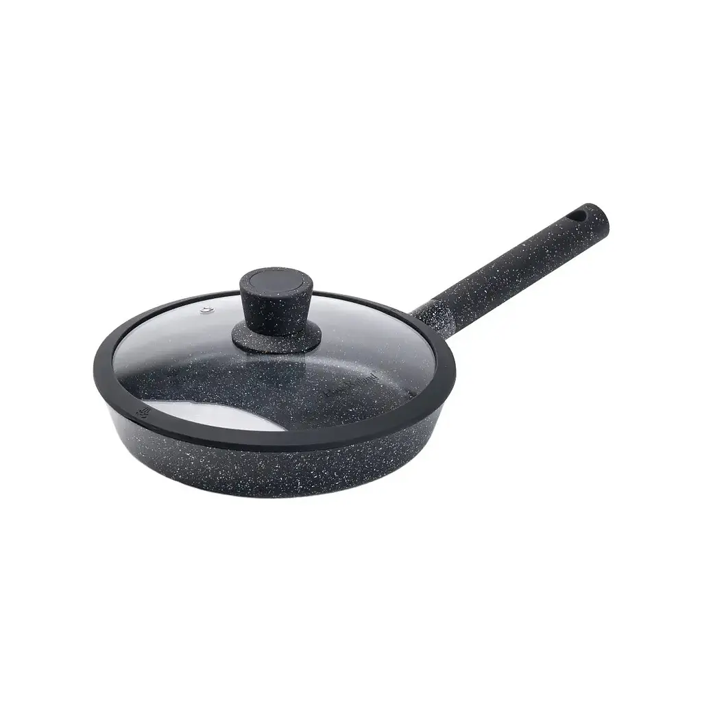 Антипригарное покрытие гарантирует, что блюда не пригорят, а очистка сковороды будет легкой и быстрой. Прочный алюминиевый корпус обеспечивает отличную теплопроводность, благодаря чему еда готовится равномерно и быстро. Пароотвод на крышке позволяет контролировать количество влаги внутри сковороды, что способствует идеальному результату приготовления.