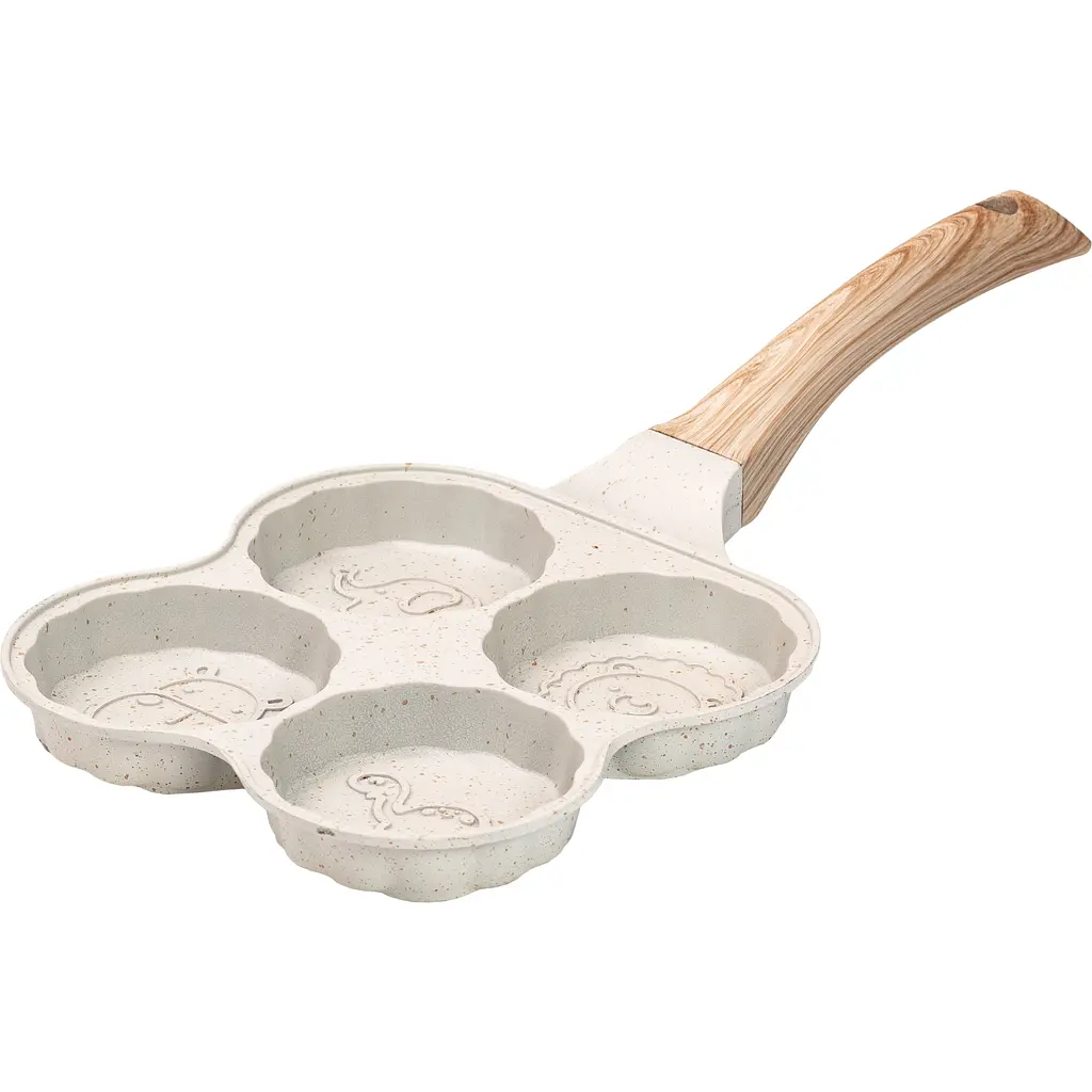 Сковорода для панкейков и оладьев - идеальный инструмент для приготовления золотистых пышных оладушек. Сковорода изготовлена из алюминия, быстро и равномерно нагревается, а антипригарная поверхность дает возможность готовить блюда с минимальным количеством масла. Сковорода имеет 4 фигурные секции объемом 120 мл с милыми зверушками и позволяет готовить не только оладьи, но и другие порционные блюда, в числе которых яичница, омлет, сырники, деруны, котлеты, зразы. Для удобства работы сковорода имеет ненагревающуюся бакелитовую ручку. Особенности использования: Сковорода предназначена для готовки на малом или среднем огне. Во время работы с посудой следует использовать деревянные или силиконовые аксессуары.