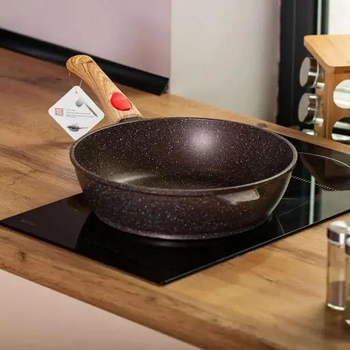 Сковорода диаметром 28 см - универсальный вариант для приготовления разнообразных блюд. Посуда изготовлена из литого алюминия, хорошо проводит тепло и обеспечивает равномерный прогрев ингредиентов. Сковорода имеет