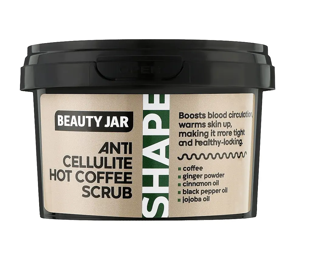 Beauty Jar Скраб для тела с кофе, имбирем, корицей, черным перцем и маслом жожоба, против целлюлита. Молотый кофе удаляет омертвевшие клетки кожи, делая ее более гладкой и однородной. Имбирь стимулирует микроциркуляцию и обладает «согревающим эффектом», что способствует подтягиванию кожи. Корица — это пряность, богатая антиоксидантами, которые улучшают эластичность кожи. Черный перец помогает похудеть, ускоряя обмен веществ. Масло жожоба уменьшает растяжки, смягчает кожу и делает ее более здоровой. Без SLS, парабенов (без вредных химикатов).