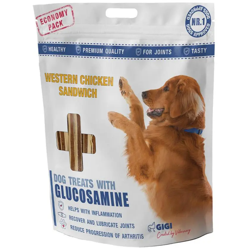 Это вкусные и полезные лакомства для ваших питомцев, обогащенные глюкозамином. Они станут прекрасным дополнением к рациону Вашей собаки, ведь обладают такими полезными свойствами: -Помогают уменьшить воспаление -Восстанавливают и смазывают суставы -Замедляют прогрессирование артрита Состав: Курица 46,7%, Рыба 20%, рисовая мука 9%, растительный белок 10%, крахмал 8%, глицерин 5,9%, соль 0,2%, сорбат калия 0,1% (1k202), глюкозамин 0,1%. Анализ: сырой белок 20%, сырые масла и жиры 3,5%, сырая зола 1,5%, сырая клетчатка 3,5%, влажность 18%. Попробуйте лакомство «Western Chicken Sandwich» от GiGi — Ваша собака будет благодарна, а ее суставы станут крепче и здоровее!