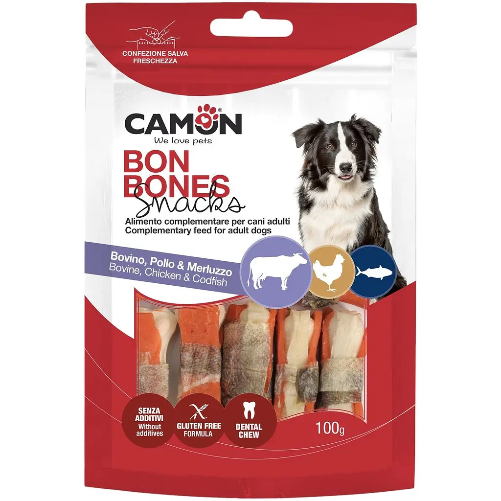 До конца акции 66 днейСнек Camon в виде миниатюрных косточек из говяжьей кожи, обернутых нежной курицей и кожей трески, станет вкусным и питательным угощением для вашего питомца. Высококачественные ингредиенты обеспечивают богатый вкус и необходимые питательные вещества, полезные для здоровья зубов, суставов и шерсти.